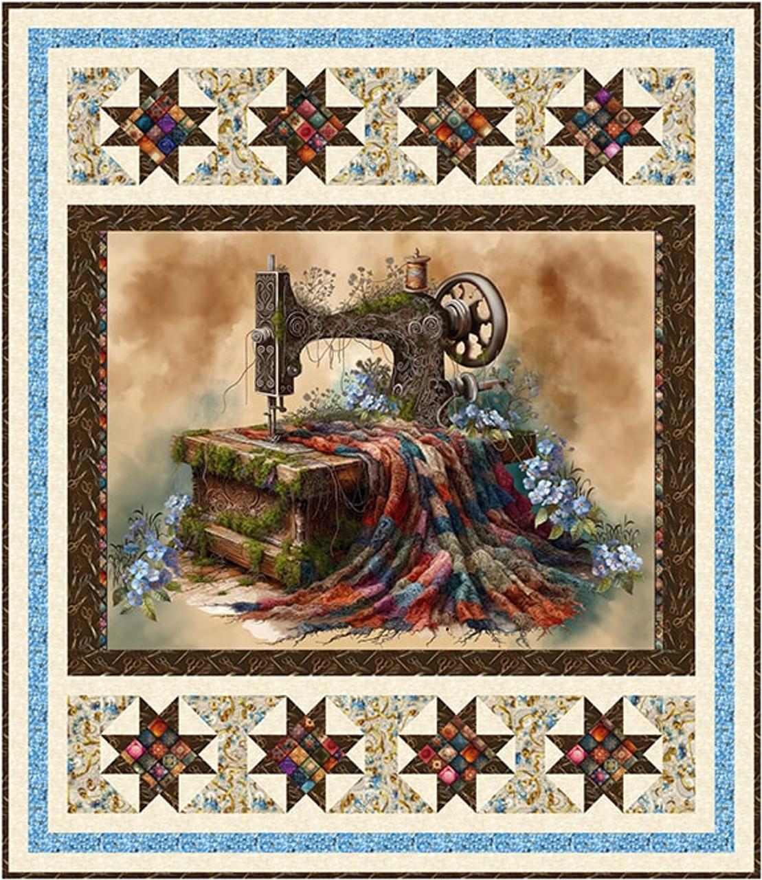 Ohio Star Blocks feature in rows above and below this 36" horizontally oriented panel from the For The Love of Pete collection by Northcott. The center of the Ohio Star blocks is cut from directional fabric so a diamond shaped template is included in the pattern. Finished size is 58" x 67"